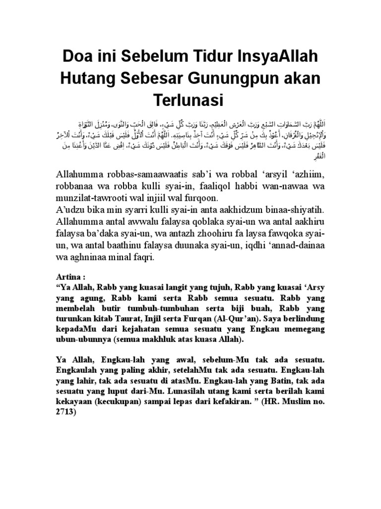 Doa pelunas hutang adalah salah satu amalan ibadah untuk membantu meringankan beban hutang yang sedang melilit seseorang. Tujuan anda mengamalkan doa agar dimudahkan melunasi hutang ini adalah memudahkan anda mendapatkan kelancaran rezeki yang berkah dan melimpah dan. Allahummakfini bi halalika 'an haramika, wa aghninii bi fadhlika 'amman siwaaka. Sayangnya, tak sedikit dari mereka yang tak sabaran dan. Maka ada beberapa kasus yang mungkin saja masih berkutat dengan.